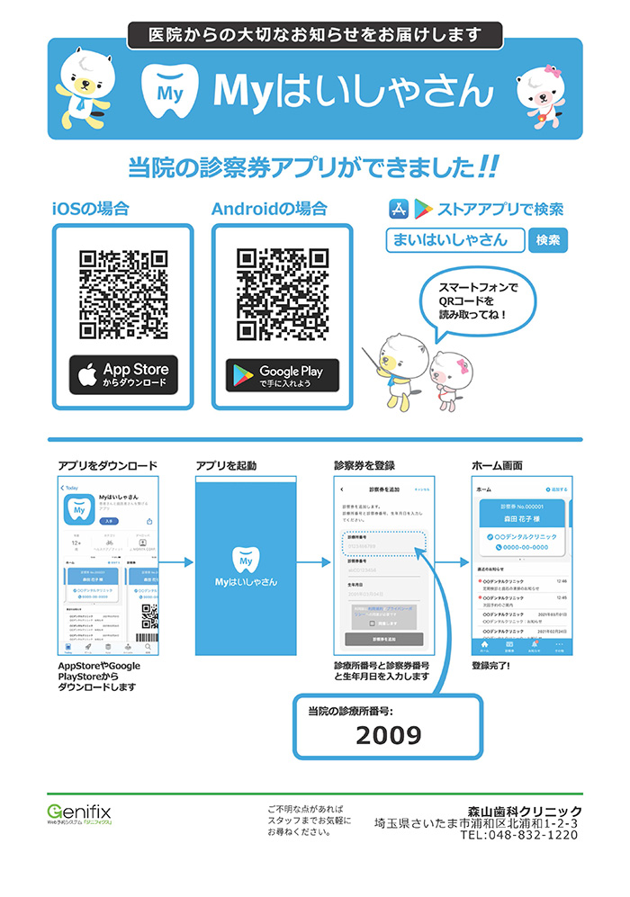 ストアアプリより、「まいはいしゃさん」と検索いただき、ご登録お願いいたします。
