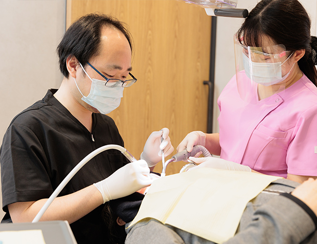 歯科医師・歯科衛生士・歯科助手・受付の各ポジションが、プロ意識をもってそれぞれの役割に取り組み、チームで協力して診療体制を組んでいます。